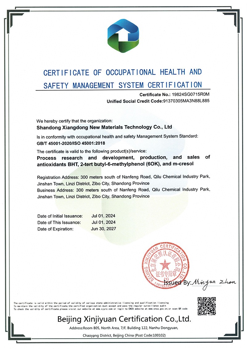 山東祥東新材料科技有限公司1.2萬噸/年6-叔丁基鄰甲(60K)、4-叔丁基鄰甲酚(偏 24 酚)和 4,6-二叔丁基鄰甲酚(偏 246 酚)烷基甲酚項目竣工環境保護驗收監測報告